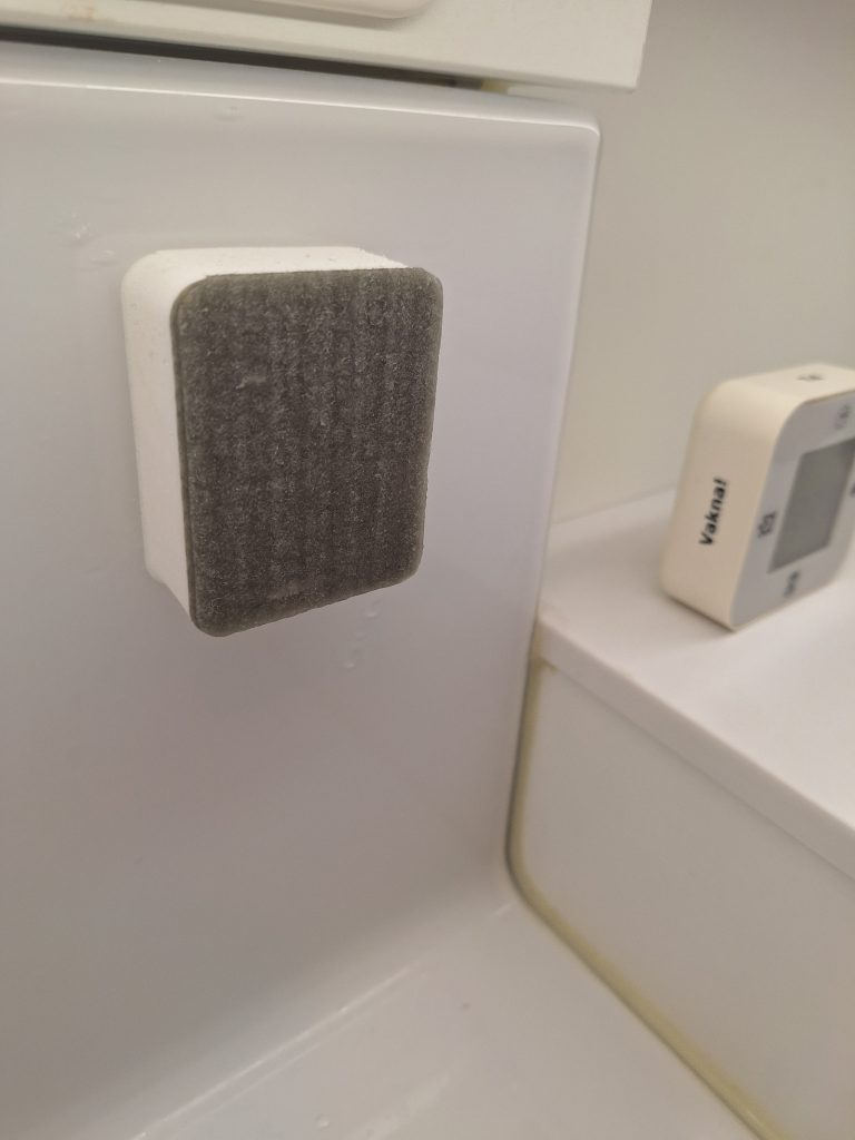 掃除が終わった後は、洗面の壁面のあたりにピトっとくっついて保管することが出来るので浮かせた状態で乾燥することが出来ます。